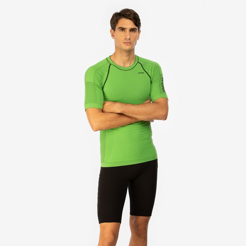 Compression sports shirt, short sleeve, light compression. Elastic garment with a very soft touch, lining made of Polypropylene yarn, for optimal breathability and sweat evacuation. Ideal for outdoor sports as a single layer, in medium and cold weather as it retains body temperature very well.